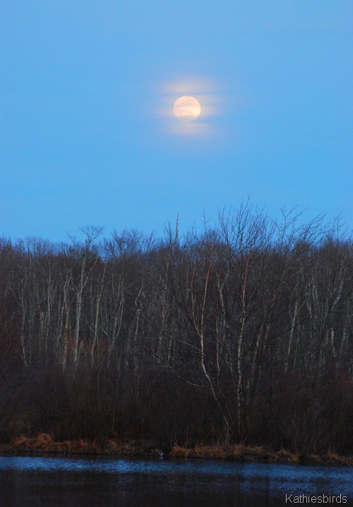 I went to count birds last Wednesday night, March 7, 2012 at Lion’s Pond in Colchester, CT. Little did I know that I would get to watch the moonrise as well. As grackles and red-winged blackbirds flew across the sky and a pair of mallards settled onto the pond, the full moon slipped up from behind the tree line and floated into the sky. What a treat!